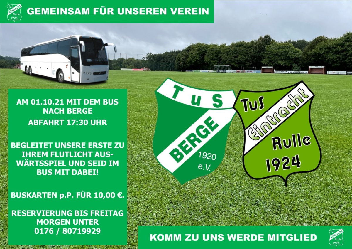 Alle Freunde und Fans unserer I. Herren haben die Möglichkeit unserer I. Herren zum Auswärtsspiel nach Berge im Bus zu begleiten. Meldet Euch unter der angegebenen Nummer bei Vincent an.