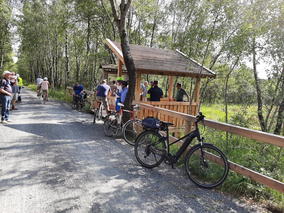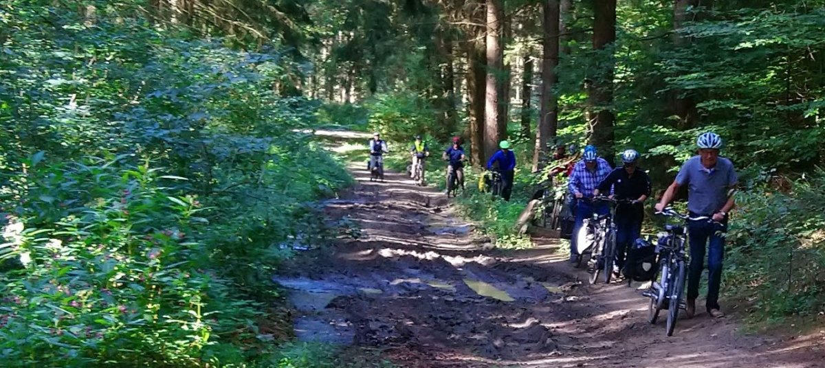 Gut gestärkt konnten wir jetzt den letzten Teil unserer Tour angehen. Einem Insidertipp folgend und mit Komoot geplant, führte uns Tourguide Michael durch die Wildnis der Ankumer Berge. Hier konnte die Geländegängigkeit einiger neuer E-Bikes ausgiebig getestet werden. Leider blieben von den Schlammpassagen wegen der 3-monatigen Trockenheit nur wenige übrig, aber man konnte schon erahnen was uns normalerweise erwartet hätte. So freuten wir uns, auf wieder festen Straßen um den „Üffelner Gehn“ herum, Achmer zu erreichen.