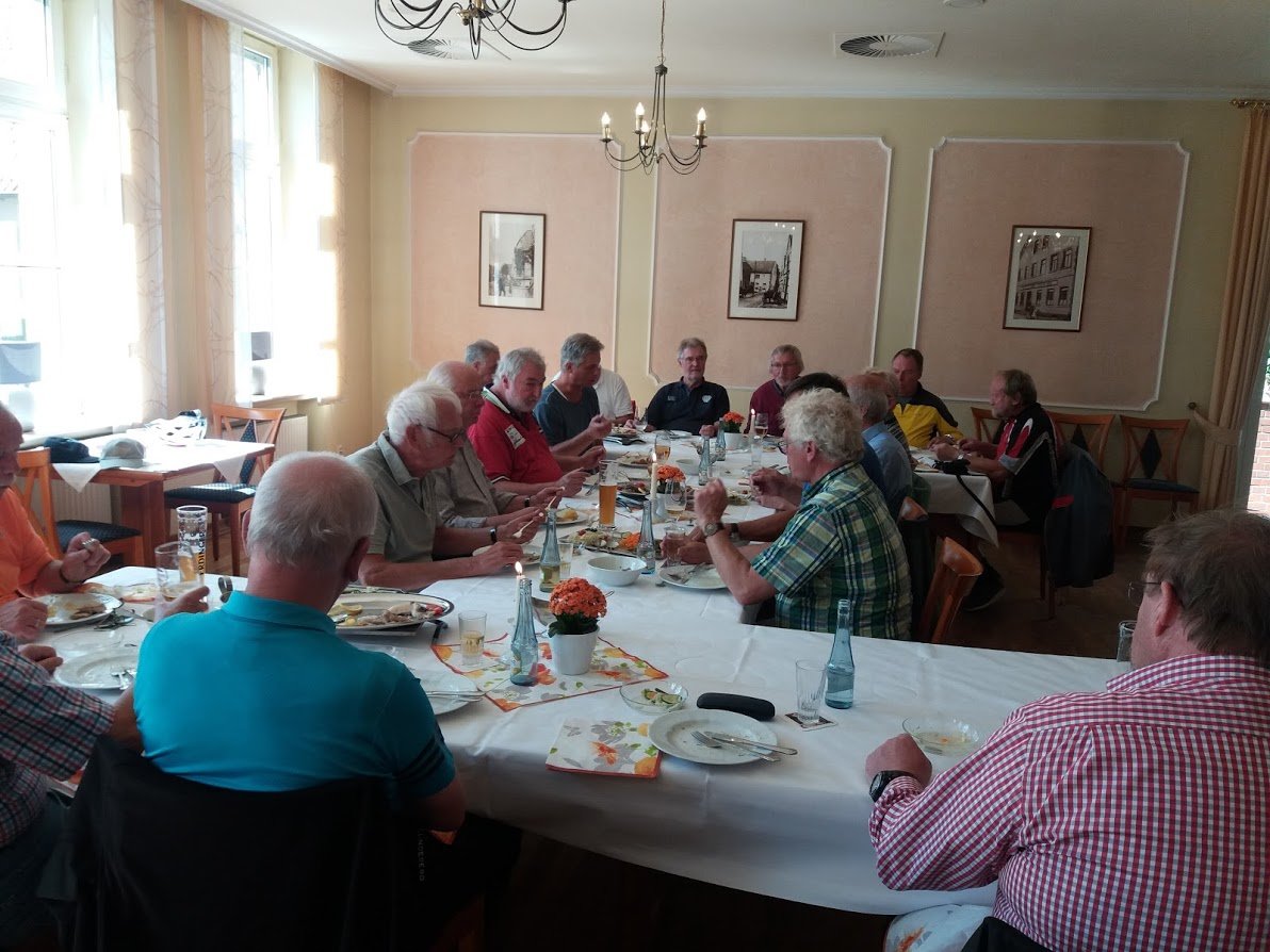 Die nächste Radetappe führte uns vom Parkplatz der Fa. Rila, wo unser Sportsfreund Werner zur Gruppe hinzu kam, über die Stemweder Berge zum Restaurant Wehebrink in Niedermehnen. Dort wurde uns berichtet, dass die Bedienungen sich plötzlich in aller Welt zerstreut hatten und man doch bitte mit dem neuen Personal nett und freundlich umgehen sollte. Für uns natürlich eine Selbstverständlichkeit! Sie gaben sich ja auch Mühe. Es war nur nicht klar wann wir was zu essen bekommen würden. Aber das was dann serviert wurde schmeckte sehr gut.