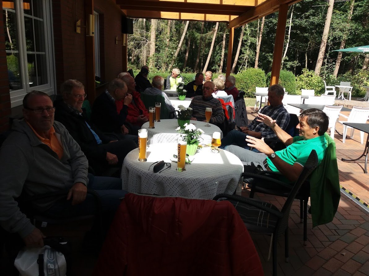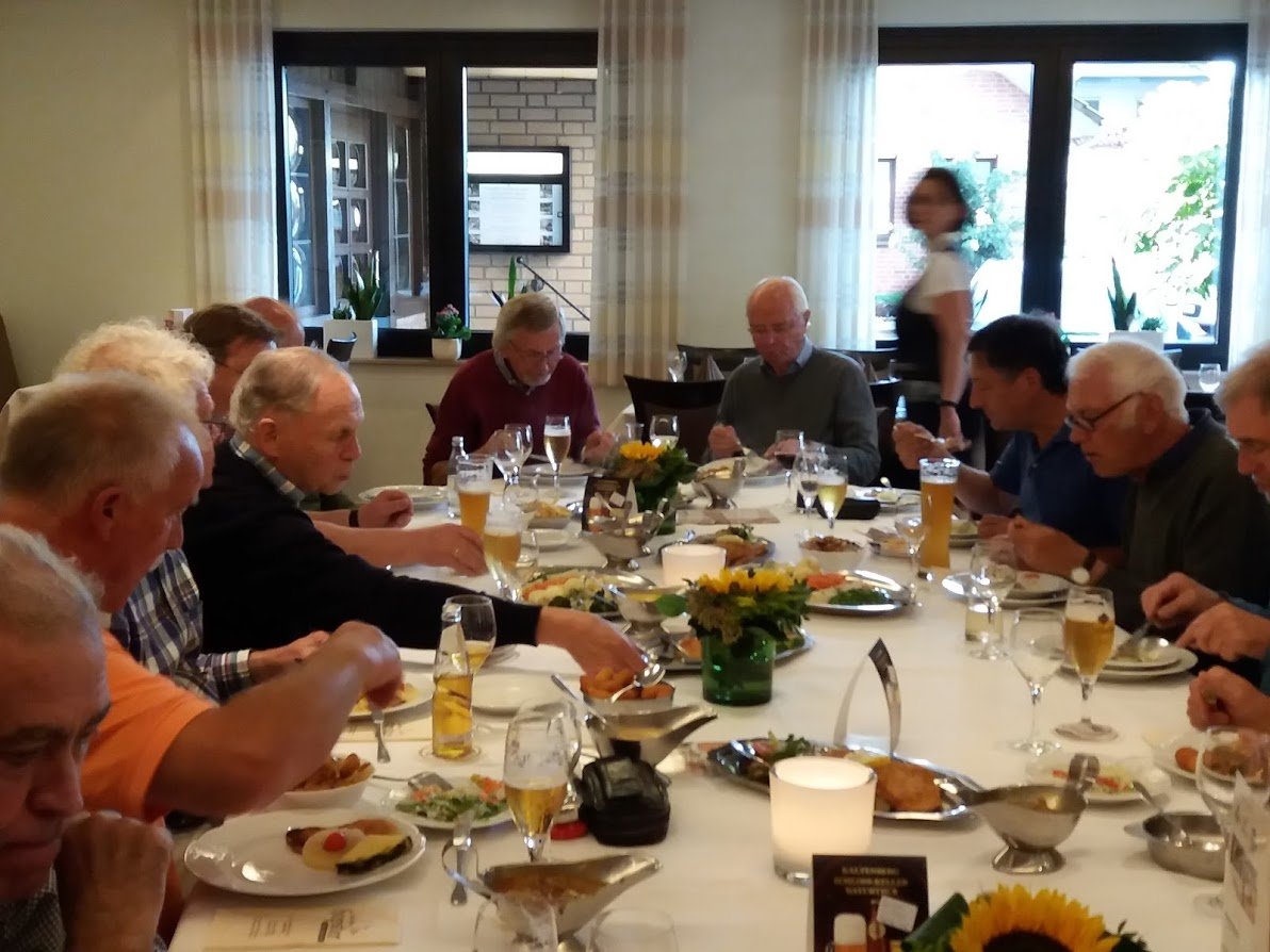 Die zwei Stunden Besichtigung vergingen wie im Flug und nach einer kleinen Erfrischung ging es zum Mittagessen, von allen erwartet über Bersenbrück zum Alfsee. Doch oh Schreck, schon wieder passte die Richtung überhaupt nicht zu unseren Vorstellungen und wir landeten wieder in Ankum beim Gasthof „zum grünen Wald“. Wo sollte das noch hinführen? Hier war das Personal sehr freundlich und flexibel und verlegte unseren Mittagstisch auf Wunsch kurzerhand in den schönen Biergarten. Schon wieder hatte jemand für uns gewählt und ruckzuck standen Schnitzel mit Salat und diversen Beilagen auf dem Tisch. Eine gute Wahl!