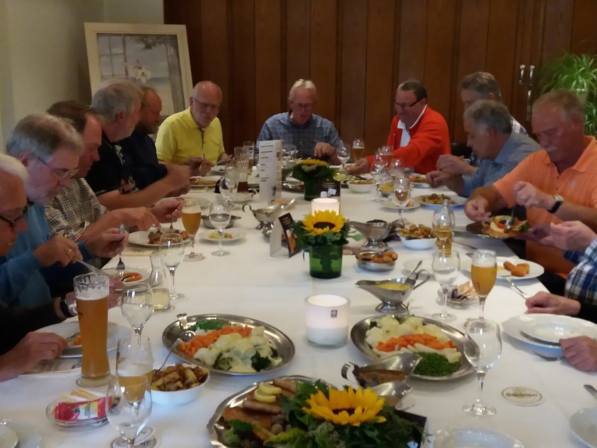 Nun kam der krönende Abschluss im Golfclub Arenshorst, natürlich mit Pflaumenkuchen. Der eine oder andere hatte ein Grinsen im Gesicht (und Sahne auf den Lippen). Nun wurde zunächst durch den „Spielführer“ Martin dem Orga-Team für das gut organisierte Wochenende gedankt. (Viel Applaus von der Gruppe).