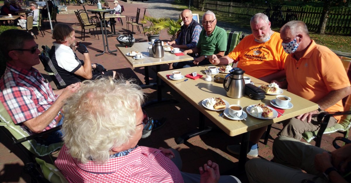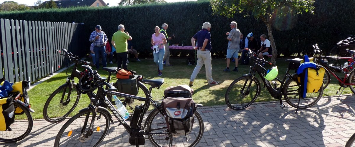 Nach einer kleinen Stärkung sattelten wir unsere Fahrräder und fuhren am Stichkanal Richtung Norden. Weiter ging es auf wunderschöner ebener Strecke über Bramsche zum Kaffeetrinken zur „alten Küsterei“ in Lage-Rieste. Hier konnten bei herrlichem Wetter draußen Platz nehmen und unseren Pflaumenkuchen genießen.