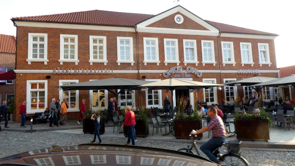 Viel Zeit zum Ausruhen gab es nicht, denn schon um 18Uhr ging es zu „Onkel Otto“, einer Erlebnisgastronomie direkt am Ankumer Dom. Hier brauchten wir nur das Getränk wählen, denn als Menu wurde uns Ente und Brathähnchen hochkant serviert. So konnte jeder nach eigenem Geschmack von den Tieren abschneiden und auch die köstlichen Beilagen genießen. Als Sahnehäubchen oben drauf gab es noch Herrencreme und Sahnetorte zum Nachtisch, ein wirklicher Genuss!