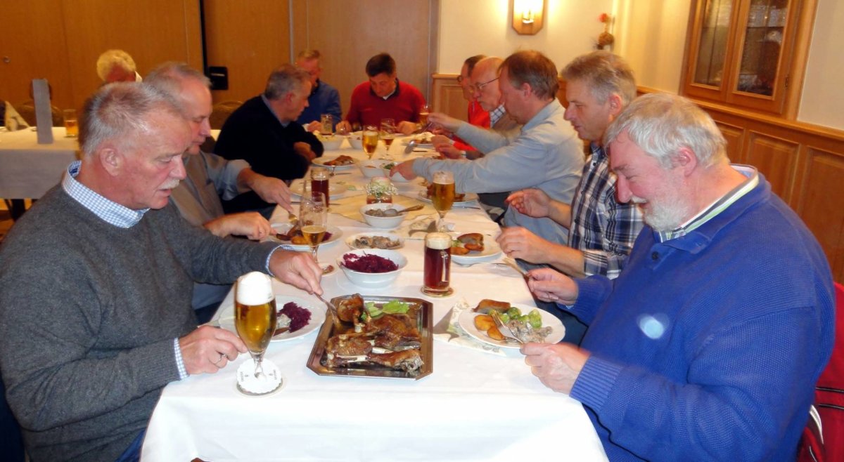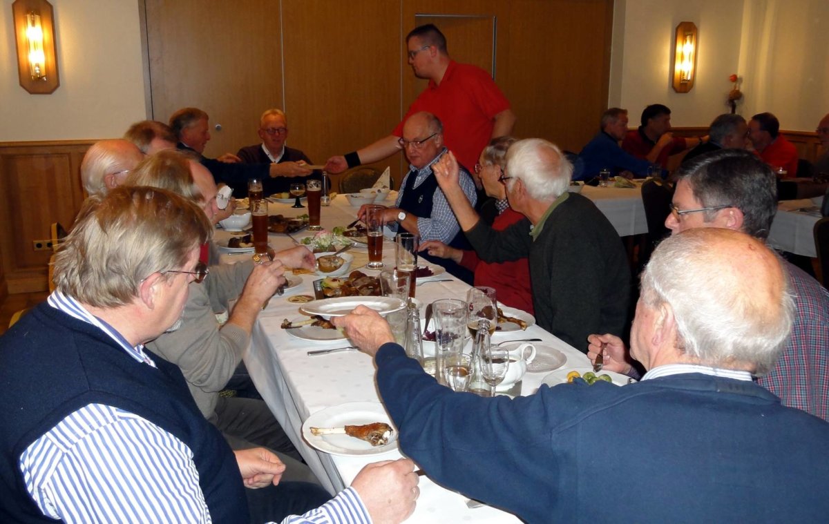 Jetzt konnte die Gans kommen, und sie kam, lecker wie immer und bis zum Abwinken. Und damit auch wirklich nichts mehr reinging, hatte Hubert Teepker anlässlich seines 60. Geburtstags eine vorzügliche Nachspeise und den dazugehörigen Absacker bestellt, eine runde Sache, vielen Dank!